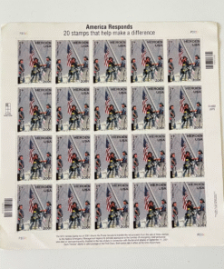 In the aftermath of September 11th. the U.S. Postal Service produced a semi-postal stamp which raised money for families affected by the terrorist attacks. It celebrated the heroism of America’s first responders and the resiliency of the nation by featuring the iconic image of three firefighters raising the American flag amid the rubble of the World Trade Center. This intact sheet of 20 stamps is a wonderful way to remember the heroes of 9/11.