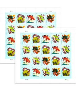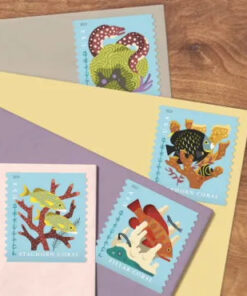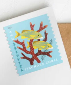 Featuring highly stylized digital portraits. the stamp art depicts four types of stony corals with associated reef fish: elkhorn coral. shown with two French angelfish; brain coral. with a spotted moray eel; staghorn coral. with bluestriped grunts; and pillar coral. with a coney grouper and neon gobies.