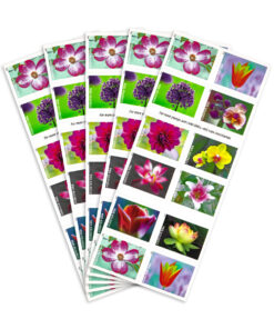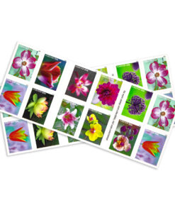These stamps celebrate America’s love of flowers and gardens with 10 new stamp designs in a booklet of 20. The stamps include a pink flowering dogwood; a rose-pink and white tulip; an allium. or ornamental onion; a pink and white Asiatic lily; a magenta dahlia; a yellow and pink American lotus; a pink moth orchid with mottled petals; a pink and white sacred lotus; an orange and yellow tulip; and a yellow moth orchid with a pink center.