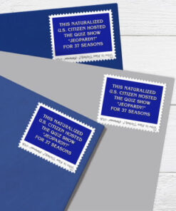 On the stamp is written the prompt. ??THIS NATURALIZED U.S. CITIZEN HOSTED THE QUIZ SHOW ‘JEOPARDY!’ FOR 37 SEASONS?? and underneath. upside down. is the correct response: ??Who is Alex Trebek???
