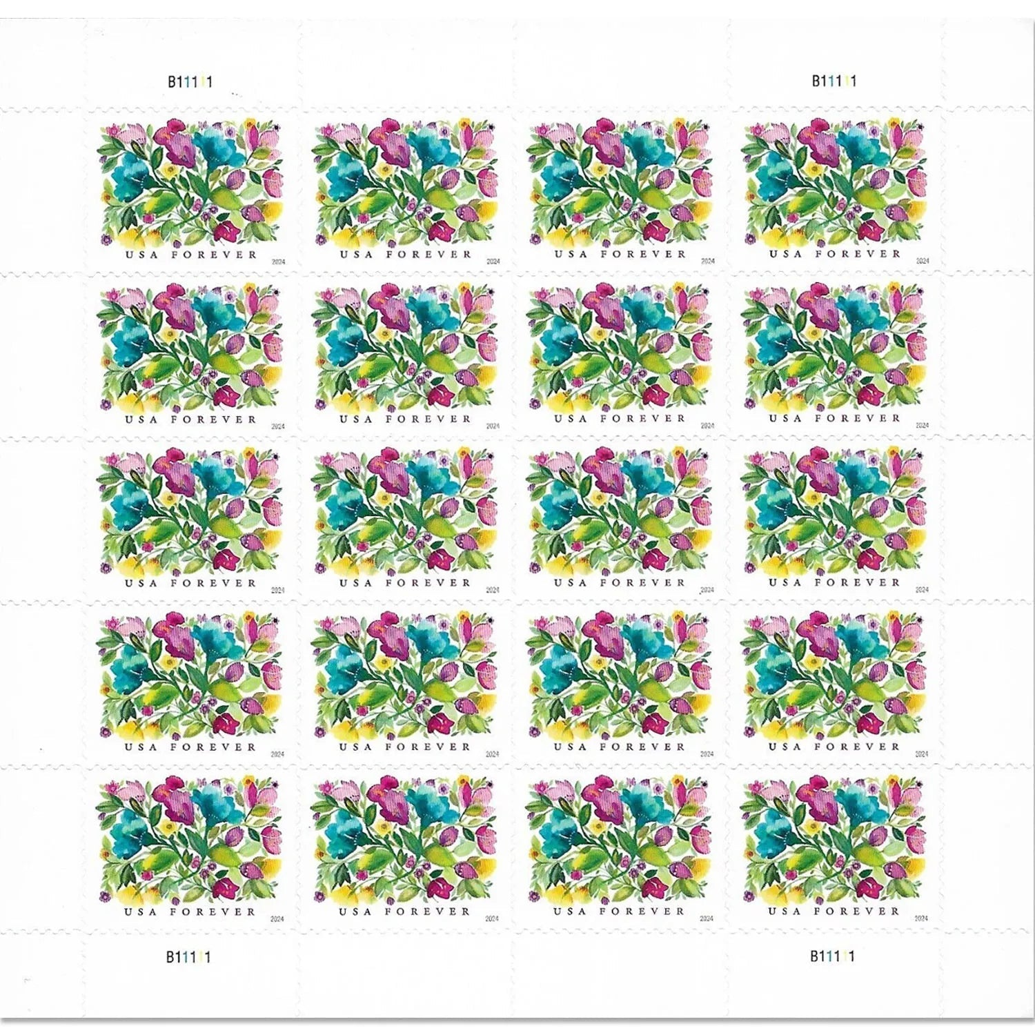 The word ??USA?? appears in violet at the bottom left of the Celebration Blooms stamp. with ??FOREVER?? in magenta just to the right.