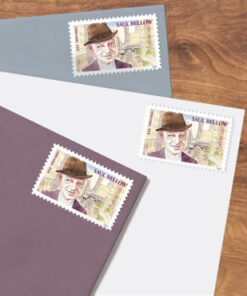 The stamp features a portrait of the author with a Chicago street scene in the background. He wears a fedora. white turtleneck and dark jacket. Behind him are skyscrapers. with the ???L???? train running between the buildings. The title ???Saul Bellow???? is in dark purple letters in the upper-right corner. with ???Three Ounce???? and ???USA???? appearing vertically along the left side.